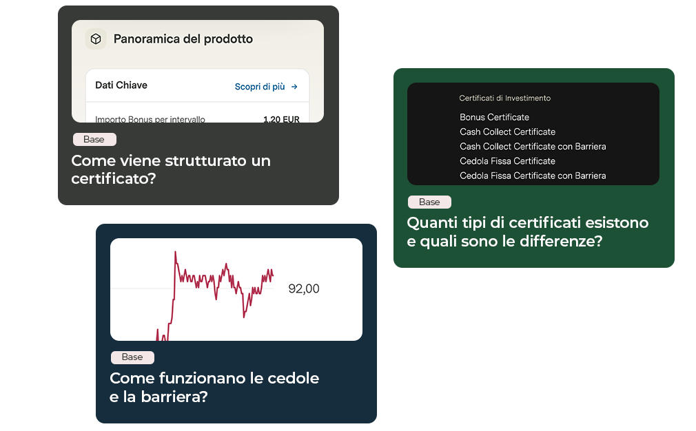 Grazie alle loro regole chiare e alle caratteristiche predefinite, i certificati ti permettono di investire con semplicità, senza dover passare ore davanti ai grafici.